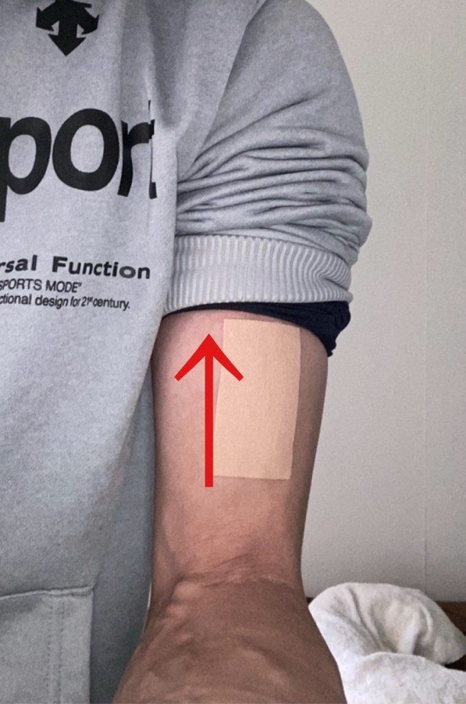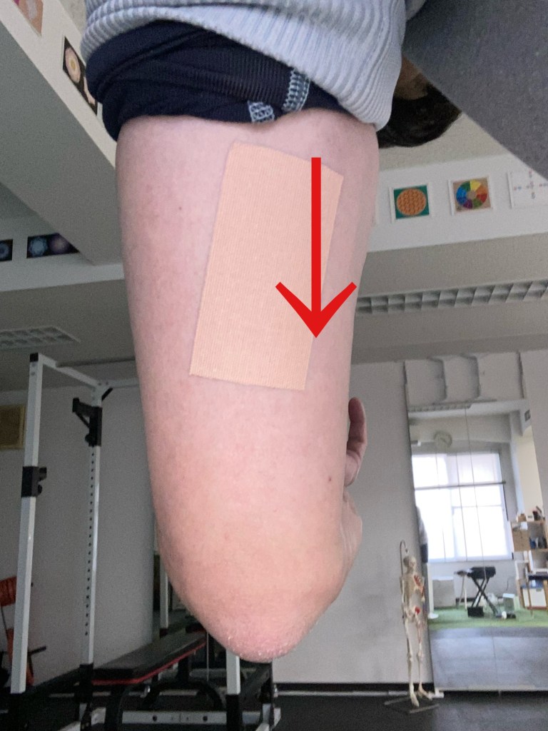 肘に関しては、上腕に付いている筋肉(上腕二頭筋、上腕三頭筋)がゆるむように皮膚を誘導してあげると肘が中間位に戻しやすくなります。