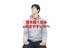 やることは、首・背中(肩)を左右動かしやすい方に動かし、その体勢をキープして深呼吸を2回して元に戻すだけです。