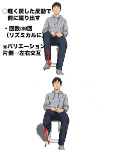 具体的なエクササイズとして、レッグエクステンション(イスに座って膝の曲げ伸ばしをする)がよく行われます